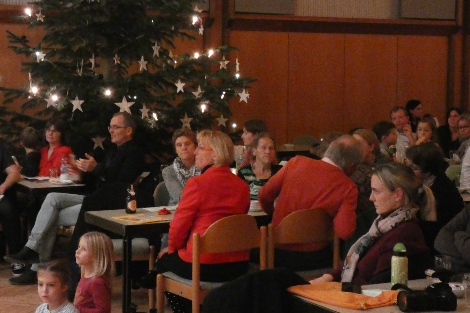 Auch der Nikolaus hatte sein Kommen angekündigt und wurde „Am Weihnachtsbaum die Lichter brennen“ begrüßt. Die Kinderaugen wurden immer größer, sie konnten es kaum er-warten, bis er zur Bühne kam. In Gedichtform ließ er das Vereinsjahr Revue passieren, lobte und dankte Schüler, Lehrer und ehrenamtliche Helfer für ihren großen Einsatz im vergange-nen Jahr. Nach dem gemeinsamen Lied „Stille Nacht, Heilige Nacht“ duften die Kinder ihre Nikolausgeschenke in Empfang nehmen. Auch die Saalkinder wurden mit einem kleinen Ge-schenk bedacht.